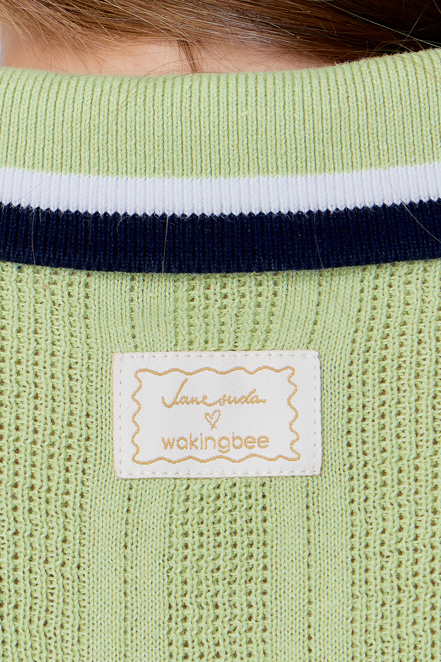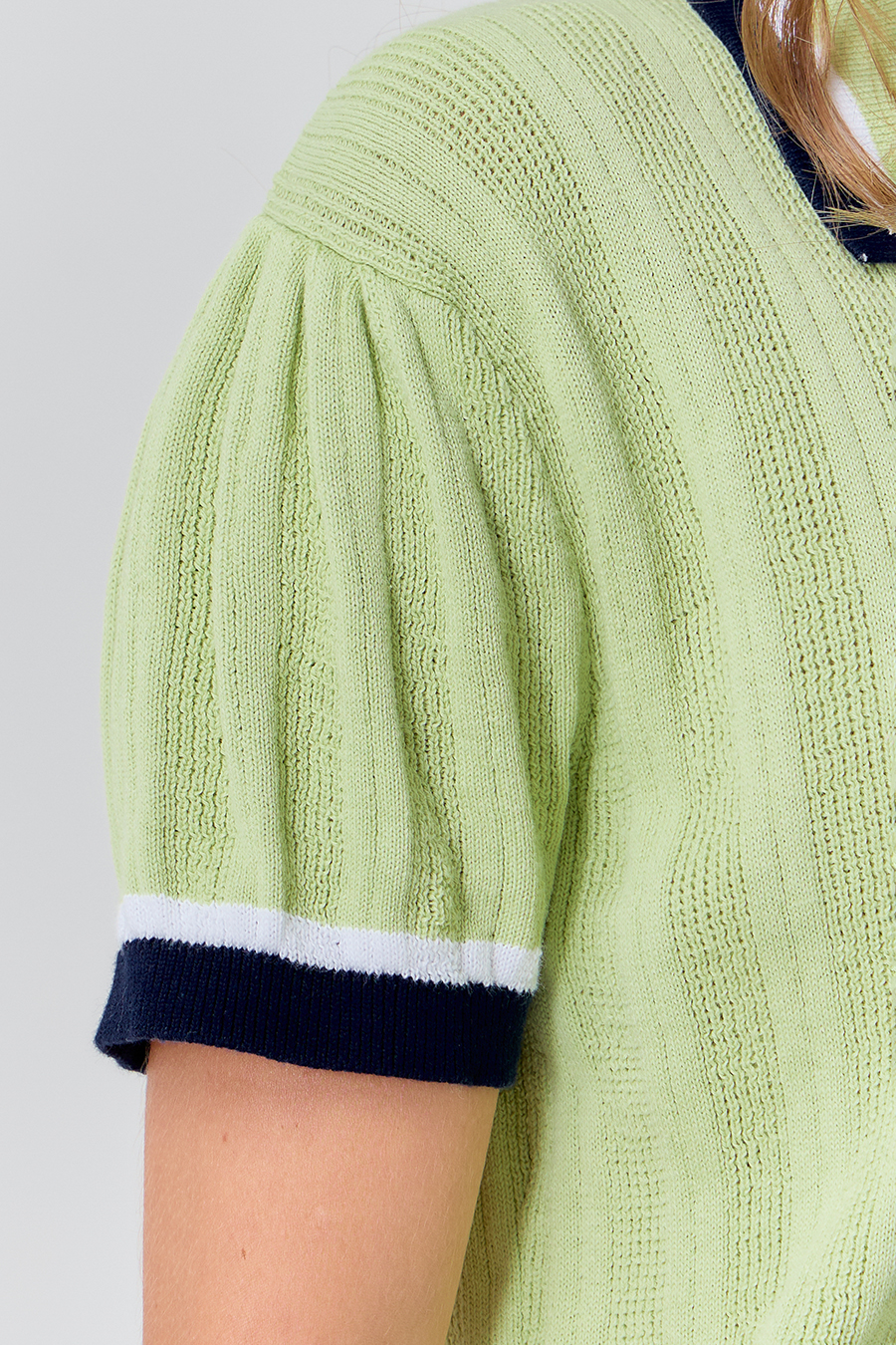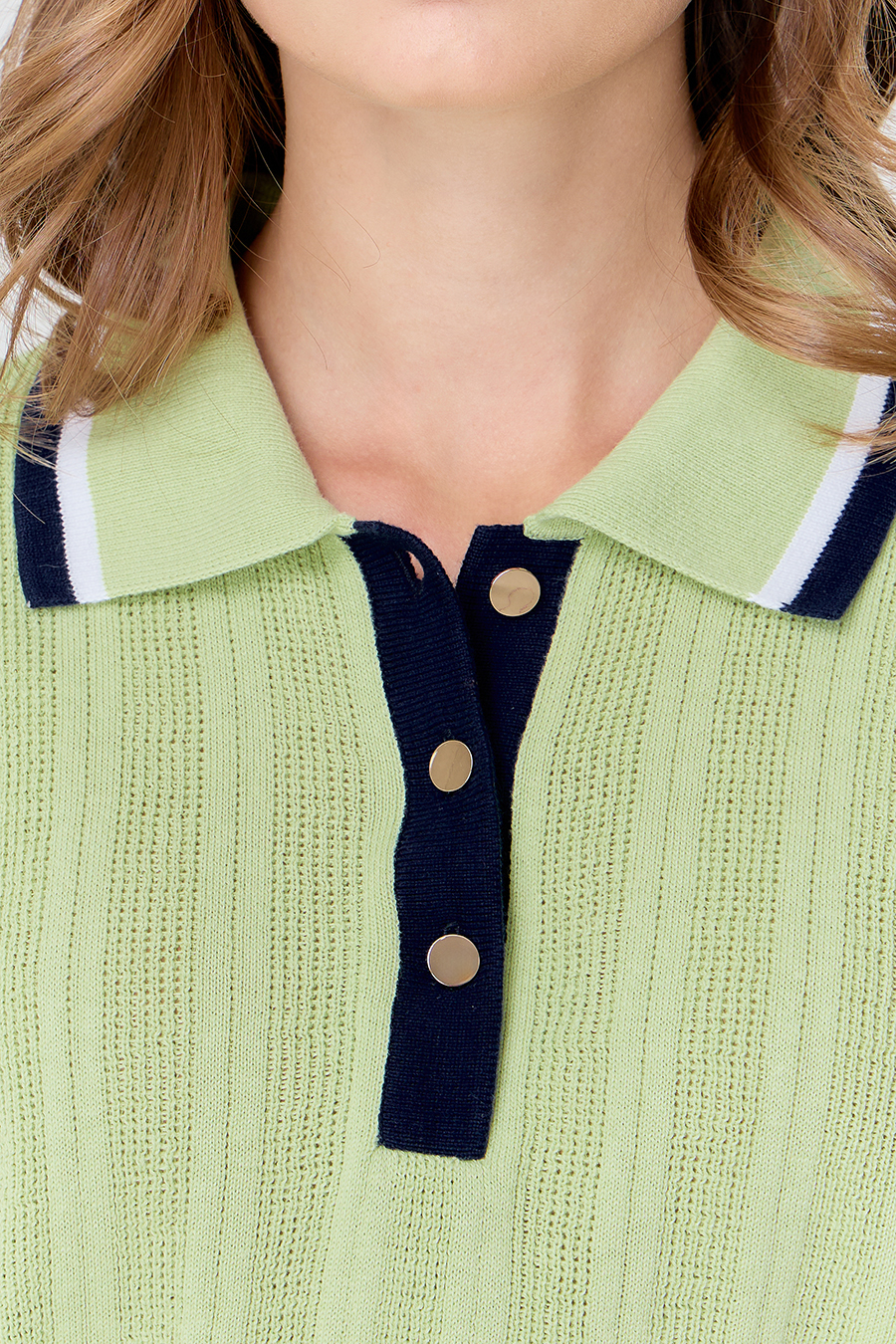 Timeless style meets modern charm in “Ivy Knit”, an elegant knit top with a sporty-chic clubhouse vibe. Designed with a classic polo collar accented by striped detailing, it brings a refined yet relaxed feel, while short sleeves with a gentle puff create a soft, feminine silhouette.