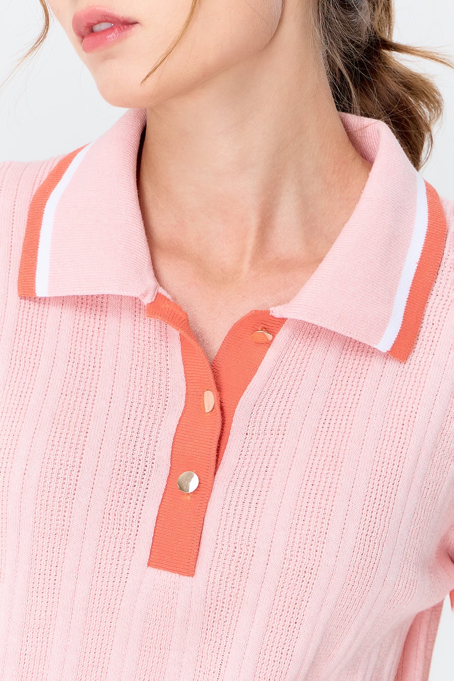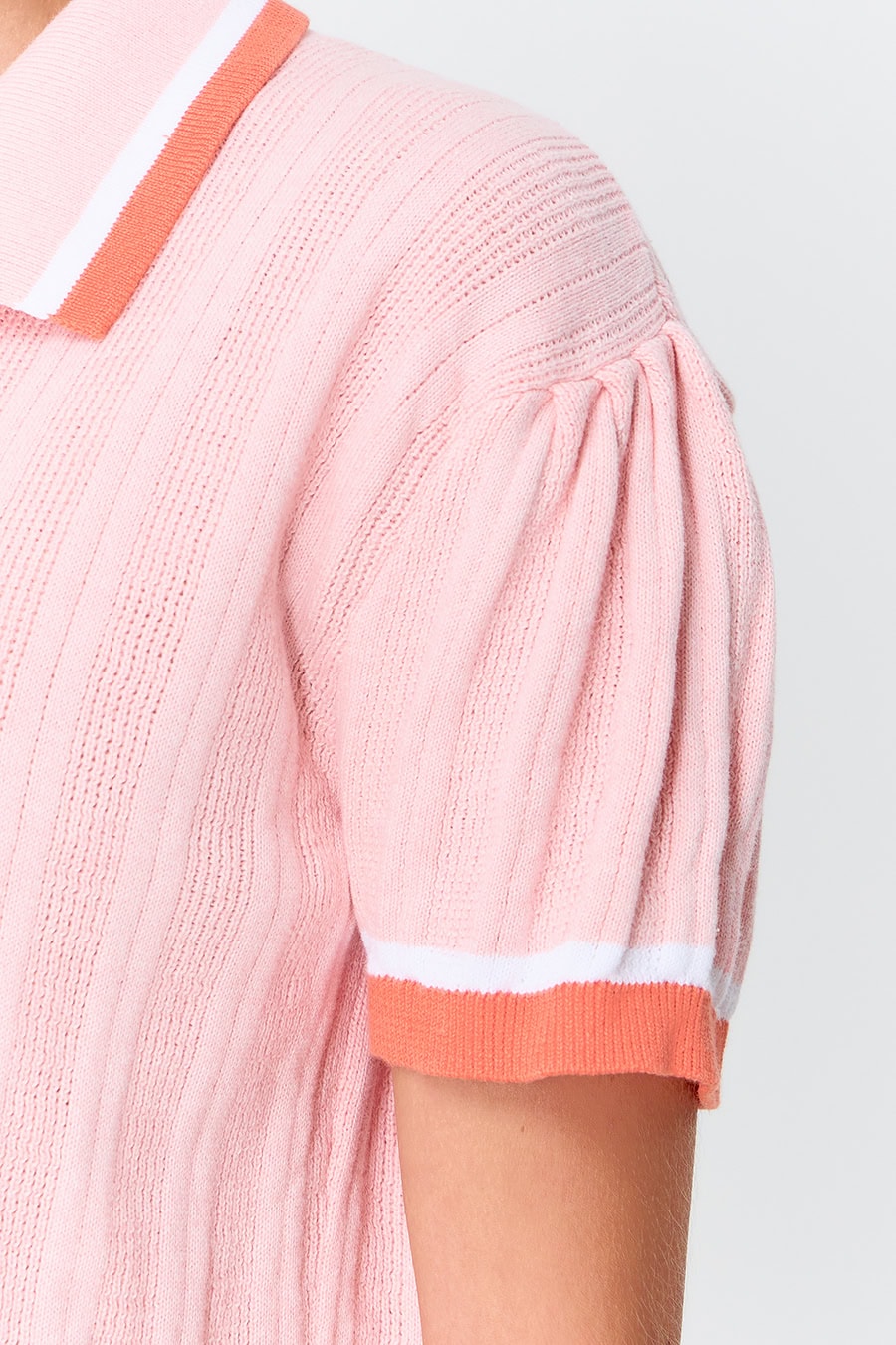 Timeless style meets modern charm in “Ivy Knit”, an elegant knit top with a sporty-chic clubhouse vibe. Designed with a classic polo collar accented by striped detailing, it brings a refined yet relaxed feel, while short sleeves with a gentle puff create a soft, feminine silhouette.