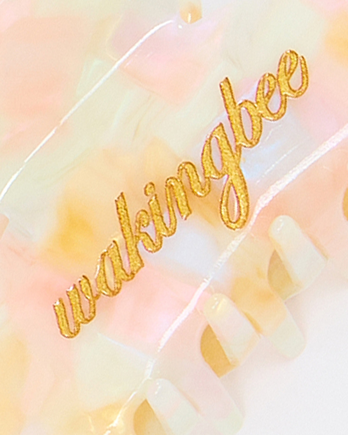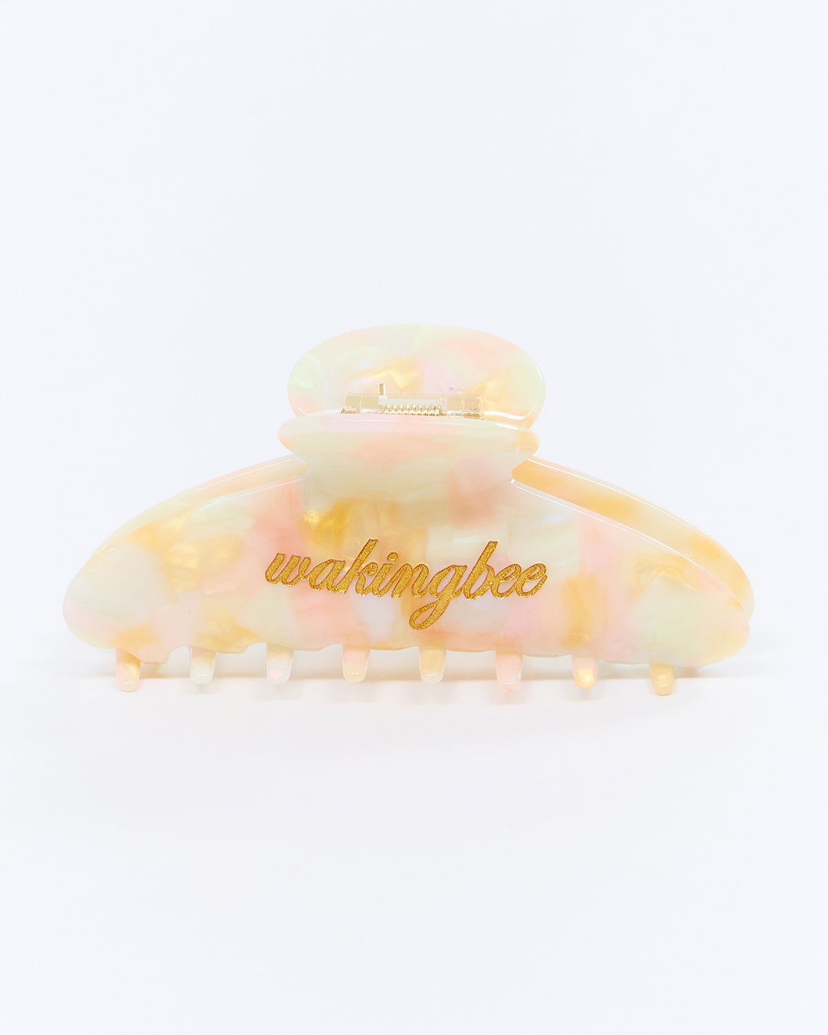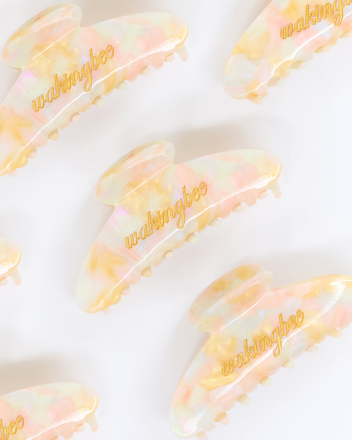 Presented in soft pastel tones inspired by seashells and sunlit shores, each piece features Wakingbee logo delicately embossed in gold on both sides. Designed to pair effortlessly with the latest swimwear collection, Seashell Hair Claw adds a subtle coastal accent to any look.