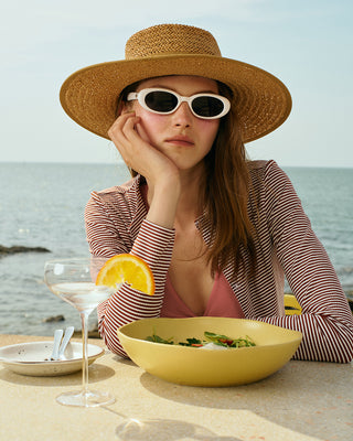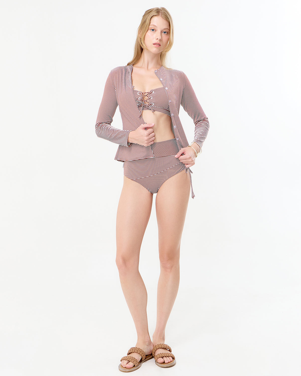 A lightweight finishing layer for sunny days by the water, "Sundeck Top" is a slim-fit long-sleeve cover designed to perfectly complement Bowline Two-Piece or elevate any swimwear look.