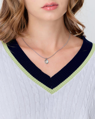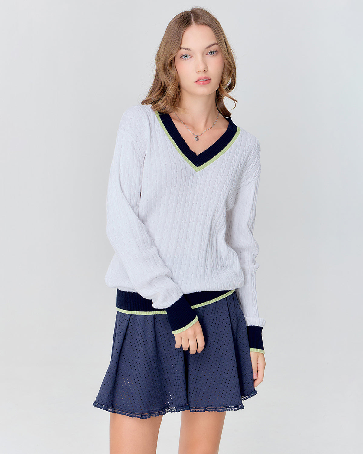 เสริมกลิ่นอายลุคคุณหนูแบบหวานละมุนด้วย "Club Sweater" เสื้อถักแขนยาวสไตล์เทนนิสคลับที่ดูเรียบโก้ ดีไซน์คอวีช่วยเปิดช่วงคอให้ลุคดูโปร่ง แถบลายทางที่ปกและชายเสื้อช่วยเติมสีสันและดีเทลน่ารัก ให้ความรู้สึกสปอร์ตชิคแบบมีคลาส